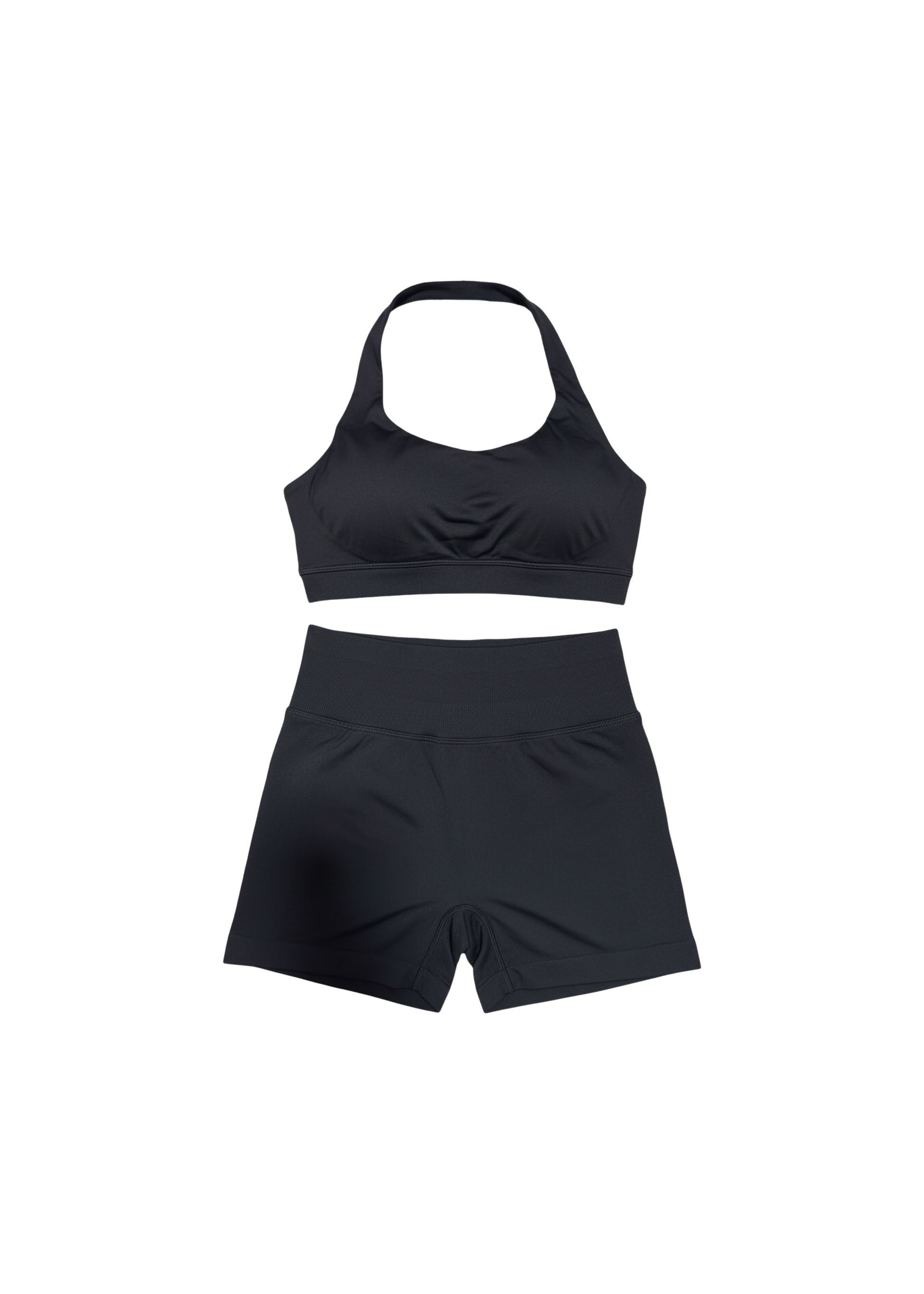 Supportive contour fit featuring a halter bra and high-rise shorts.